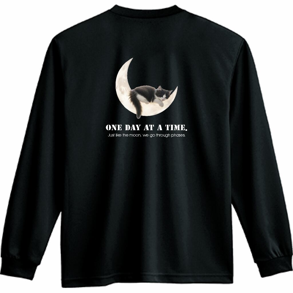 背中に描かれた「月と猫」のアートが印象的な、ロングスリーブTシャツ。